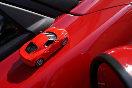 サイドミラー赤 リアハッチ横のエアベント 西松屋 SmartAngel ダイキャストミニカー アルファロメオ4C 自分の4Cと同じ配色のミニカーを探している。クーペのベースモデル赤、サイドミラー赤、梅ホイールは黒というのが意外に見付からない。西松屋のミニカー…